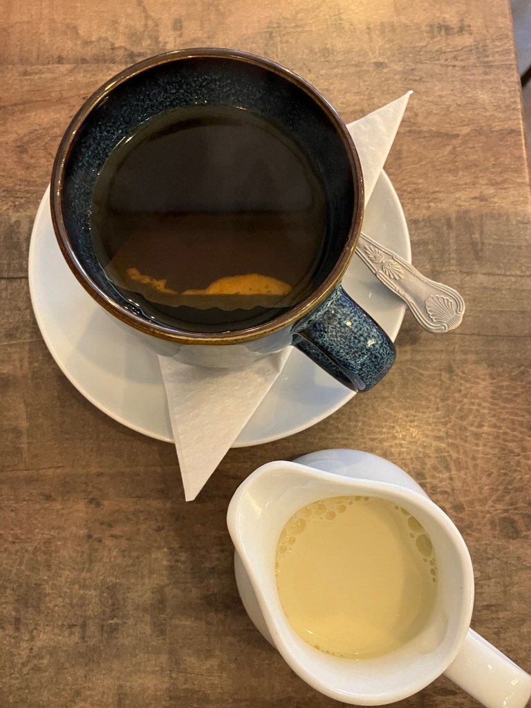 My tea arrives in a lovely big round mug, with the bag steeping nicely and a spoon on the side, plus a very generous jug of oat milk. There’s no tag on the bag, but the brew looks rich and promising. I’m not blown away, but the tea is warm and satisfying, and the cup is delightful to hold.